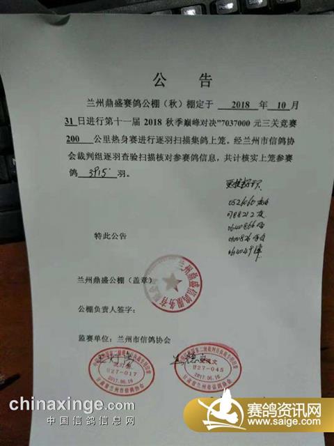 兰州鼎盛赛鸽公棚(2018)秋第一关集鸽现场图集