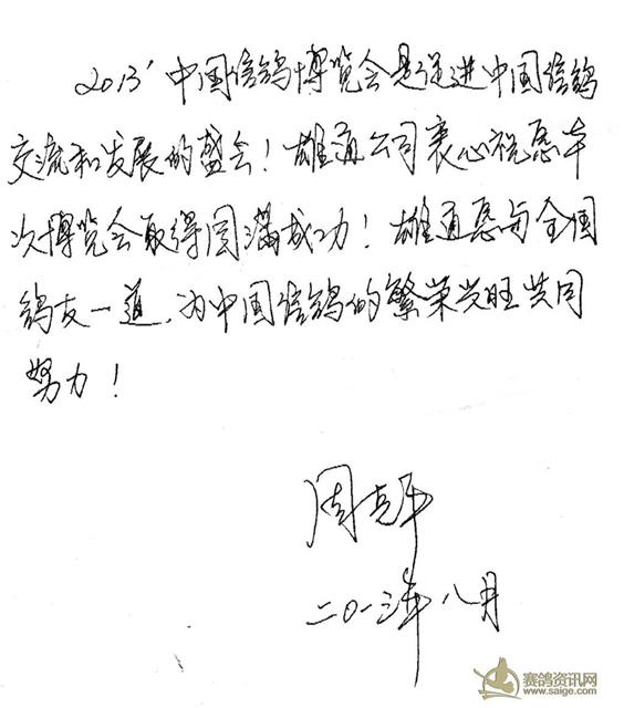 附一:出席2013年中国信鸽文化博览会启动仪式嘉宾名单 中国信鸽文化博览会组委会衷心感谢各位嘉宾在百忙之中专程出席启动仪式。出席本次活动的嘉宾名单: (部分嘉宾因临时有事未能出席,本名单如有遗漏请多多谅解,以下排名不分先后。) 北京蓝羽公棚 王京生 北京首信公棚 丁海超 北京兰翔公棚 李桂新 许建国 北京新隆华飞翔赛鸽公棚 冉俊儒 北京国信达公棚 魏经理 春辉公棚刘春辉 北京得元林海信鸽养殖中心 高林 继杰 北京惠翔公棚 张劲松 北京赛客公棚 韩兵 北京玉翅通达公棚 王明水 中国国家信鸽公棚严芳 李忠进 北京京维 尹小维 北京侨友公棚 陈伯懿 廊坊燕郊京亿赛鸽中心 赵文东 长明赛鸽中心 刘长明 陈继杰 北京爱亚卡普王志军 王志刚 北京大宋鸽舍 宋辉 北京三路通顺信鸽养殖中心 马凤强 北京胜奥鸽具(鸽粮)王保春 王保生 北京万军鸽舍 乔万军 日不落鸽舍 刘新民 极境源赛鸽公棚 齐建明 皓月公棚 曹振连 北京金鼎同福赛鸽公棚 秦江 北京三赢国际文化交流有限公司 孟武 北京中瑞鸿昊赛鸽公棚 王俊峰 长空操练赛鸽联盟 张玮 北京亿丰万豪国际赛鸽中心 张威 高红蕾鸽舍 高红蕾 北京天聚缘赛鸽联盟 赵海泉 北京翔瑞缘公棚 邢光普 北京杨士杰鸽舍 杨士杰 谁有更好”赛鸽中心 毕家慧 中智万博赛 张茜 伟鸽鸽药 刘林贵 北京双祜龙信鸽养殖中心 商宝贵 北京方圆顺达 梁超 九龙鸽舍 孟宪伟 国强鸽舍 鲁国强 北京翔龙鸽舍 孙忻 李氏鸽业 李化祥 欧洲信鸽站 曹小姐 北京翠涛鸽具 张文涛 中美格林豪斯 马平 翔冠鸽具 续滨 瓦季卡博士 于涛 翔大赛鸽 张诗阳 付氏兄弟鸽舍 付学军 吕氏鸽业 吕国仓 杜平魁星 杜平 田德生鸽舍 田德生 飙友鸽业 赵建章 卓越星 马平 开创者 苏泉霖 长江鸽业 王辉 威廉•杨鸽舍 威廉•杨 华侨赛鸽 孙伟 李明亮鸽舍 李明亮 天殖园 夏军 金马鸽舍 李立明 北京正点鸽舍 李远征 北京铭扬鸽舍 杜长顺 飞龙鸽事企业 秘林林 南通雄通 周克平 台湾行健行 陈振标 天津日野 马吉明 卫东鸽舍 夏卫东 台湾搏胜 谢秦 香港赛鸽 杨志坚 高王宏种鸽中心 高王宏 极速鸽舍 陈仕义 东龙赛鸽中心 郑东龙 西安凯鸽 王军 台湾明月 曾国辅 何向坤鸽舍 何向坤 德国捷飞达 黄文龙 术武鸽舍 王术武 王冠鸽具 吴金辉 兆尊馆 胡维奇 亚健康研究所 张少锋 山东安华鸽业 王志安 唐山法兰西鸽舍 吴玉琢 群翔鸽药 刘小军 振军鸽舍 任振军 宇翔鸽舍 刘庚 珍铭阁 王书 辽宁鸣威公棚 郭凤学 鑫诺鸽药 贺浩 温氏鸽业 温茂 南洋鸽业 侯小兵 长春盛世公棚 盛晓明 爱信鸽业 李翠萍 比利时博格 冯景明 张明发鸽舍 张明发 信鸽中国 林淼生 西安心连心 张萍 冲天鸽舍 李恩立 天佑鸽舍 杨天佑 忠盛公棚 李屹 唐山坤鹏 张坤 湖北神通鸽舍 姚军 中鸽协记者站 张本红 陈永山鸽业 高靖淮 灵峰鸽药 孔维振 青岛嘉信 周国勇 翔霸鸽药 姜铁仓 舜峰赛鸽 李文峰 夺旗鸽舍 陈建军 金泽翔羽 金易兴 帝王鸽舍 毛芳群 飞神鸽药 张勇 鹏翔鸽药 张军 河北影视公棚 寇彪 龙马鸽舍 马维强 百世恒 张华雷 标榜鸽具 刘泽锋 东方胜地公棚 李智卓 中德信鸽文化交流 孙学方 丹尼斯 朱静 台湾兴翔铭鸽 黄嗣炯 西安阳光家园 吴军 北京信鸽文化传媒 张傲然 红天马鸽粮 齐建强 蓝翔鸽粮 德国博士鸽药 张洋 三连冠鸽药 李兴明 新大陆 邱嗣高 安德珠鸽舍 安德珠 中天凯迪 杨士博 中顺国际 焦顺才 飞赛鸽粮 刘颖 阳光鸽舍 张超 赵源山农大药业有限公司 张帅 品龙贸易 陆卫峰 高双鸽业 高双 华美鸽具 邱福星 天津佳翔鸽用品 姜振昌 升华鸽粮 张洪生 先锋鸽药 原星 唐山开尔 李学卫 陶瑞斯 杨成 倍健环保科技 朱辉 年冠 田罡 台湾红桥企业 赖鑫耀 大连嘉禾 尚彦勇 冠羽鸽具 李保增 广州耐久能生物有限公司 杨茂成 家俊鸽业 荆春雷 国顺家具 潘绍祥 舍舍叫 谢明栓 振宇国际 胡振宇 闪电兄弟鸽舍 郑毅杰 西安德翔鸽药 杜经理 东方一铭生活馆 李春生 和泰鸽园 曾泰元 长春吉翔鸽笼具厂 杨成彬 辽宁忠旺 周凤亮顺兴鸽舍 郭兴楷 宏刚兄弟鸽舍 孙锐刚 好速度鸽粮 殷茂祥 皇家摄影 周宏志 北京东鸽 孙小东 国家 裁判 张高立 油人鸽舍刘小姐 超越鸽具杨世振 真有国际田先生 天一鸽业胡永伟 润天羽鸽业张亚军 东莞塘厦雨竹塑胶制品厂李展华 台湾盖比 施正会 格莱德常鸿宇 大朗鸽士锋李国艳 北京天友万家鸽粮 吴志峰 北斗鸽药 辛华 奇迹鸽舍 齐建勋 天体鸽业 王群励 日本太空武器 王先生 詹森传承 石红艳 上海藏鑫阁 王强 天津小青鸽舍 黄箬青 谢艳彬鸽舍 谢艳彬 库瑞斯克雷博 郭小姐 附二:2013年中国信鸽文化博览会启动仪式赞助企业中国兆尊馆祝贺信: 中国信鸽文化博览会: 非常荣幸受邀参加中国信鸽文化博览会,深表感谢! 中国信鸽文化博览会将于2013年11月盛大开幕,这是一个弘扬中国信鸽文化、展示中国信鸽风采的盛会; 是促进中国信鸽文化交流和发展的盛会;是推动中国信鸽冲出亚洲走向世界的盛会;为中国信鸽打造正能量 ,实现中国信鸽世界强国之梦! 我以中国兆尊馆的名义,向中国信鸽文化博览会致以最真诚的祝贺,祝博览会盛况空前、圆满成功! 中国兆尊馆 胡维奇 2013年8月26日于上海 附三:2013年中国信鸽文化博览会门票赞助企业,江苏南通雄通公司祝贺信: