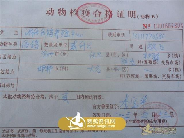各位尊敬的参展商: 您们好! 感谢大家的大力支持,积级参加2013年中国信鸽文化博览会。 如带鸽子参展,请带好动物检疫合格证明,以备各路口公安检查。组委会虽将竭力协助,但手续齐全是对我们自己最大的保护。提前麻烦一点,就安全踏实多了。 拜托各位!盼相互转告! 下面是检疫合格证明样票。