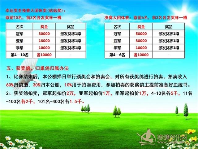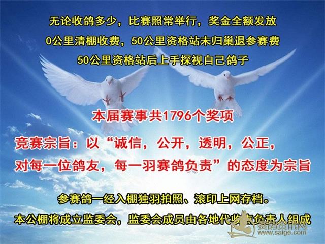 尊敬的广大鸽友:大家好 广东汕头欣洋公棚(春棚)2019年第五届收鸽即将圆满结束 首先,感谢广大鸽友及各地区代理,对欣洋公棚的支持与信任。 本棚收鸽截止于2018年12月31日封棚(倒计10天),请未送爱鸽到我棚的鸽友,尽快安排好时间交鸽,还请鸽友们相互转告谢谢。再次感谢鸽友的支持与信任。 广东汕头欣洋公棚以诚信待人的服务宗旨,竭力给每一位鸽友提供一个公平,公开,公正的赛事平台。 我们必将竭尽全力做好每一羽赛鸽的饲养、管理与训练,一定不辜负您的信任。 最后预祝鸽友们在各大赛事中赛出好成绩,再创辉煌!