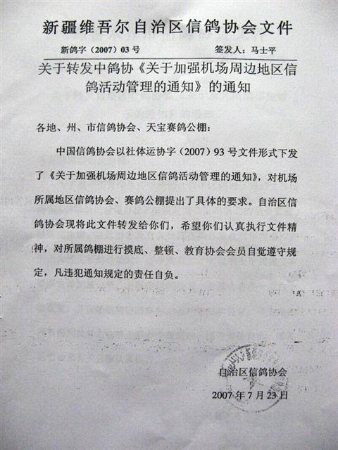 关于转发中鸽协《关于加强机场周边地区信鸽活动管理的通知》-新疆信鸽协会