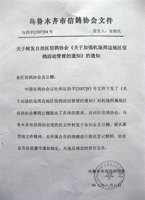 关于转发自治区信鸽协会《关于加强机场周边地区信鸽活动管理的通知》-乌鲁木齐市信鸽协会