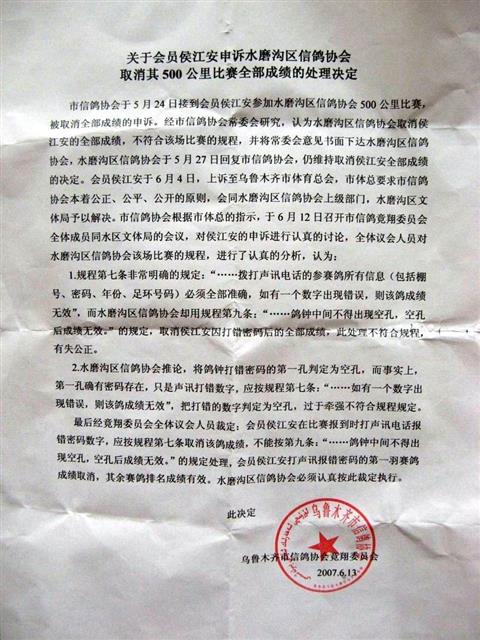 关于会员侯江安申诉“水区信鸽协会取消其500公里比赛的全部成绩”的处理决定