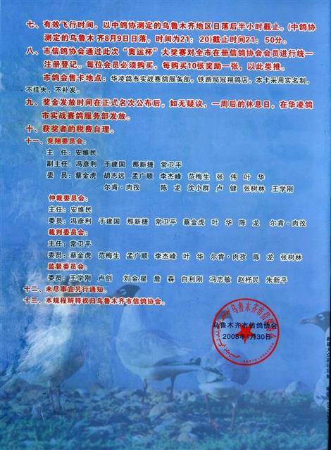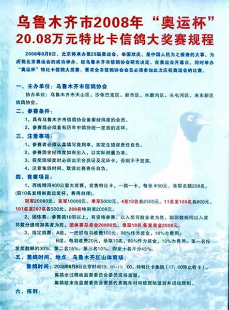 乌鲁木齐市2008“奥运杯”特比卡信鸽大奖赛