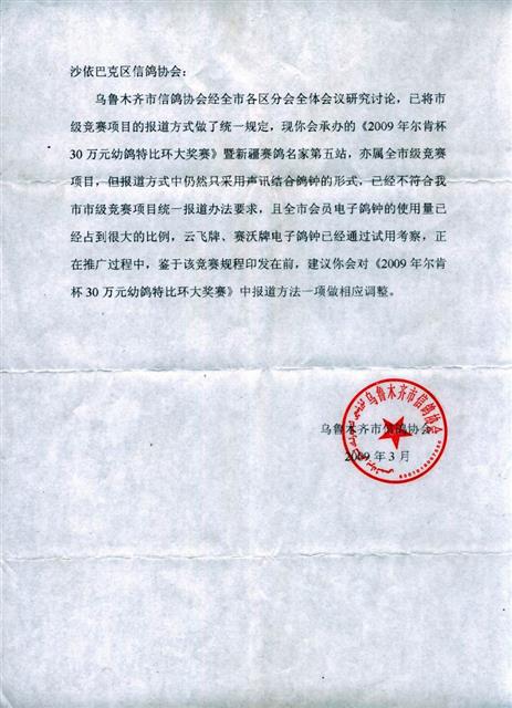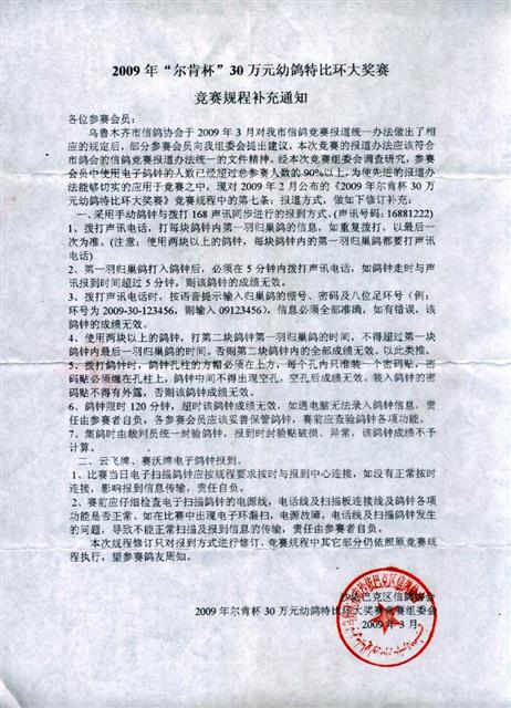 乌鲁木齐2009年“艾肯杯”30万元幼鸽特比环规程补充通知