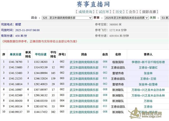 鹤壁560公里战况揭晓!武汉朴甜鸽第三关冠军分速1341.76