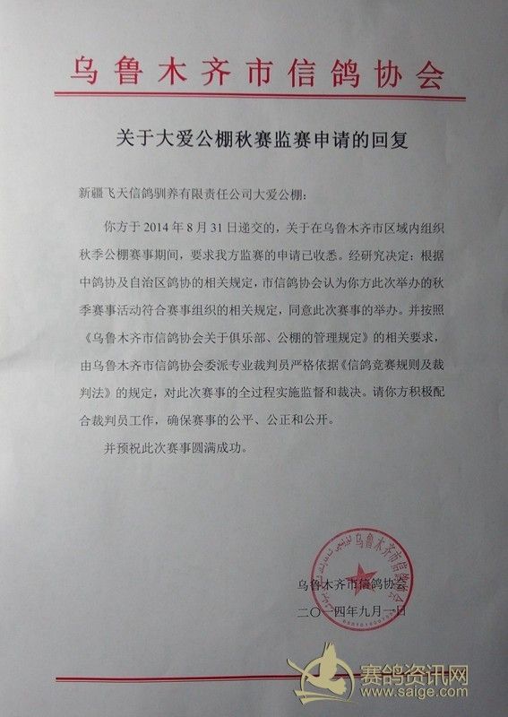 乌鲁木齐市信鸽协会关于大爱公棚秋赛监赛申请的回复