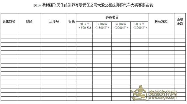 附表:2014年新疆飞天信鸽驯养有限责任公司大爱公棚雄狮杯汽车大奖赛报名表
