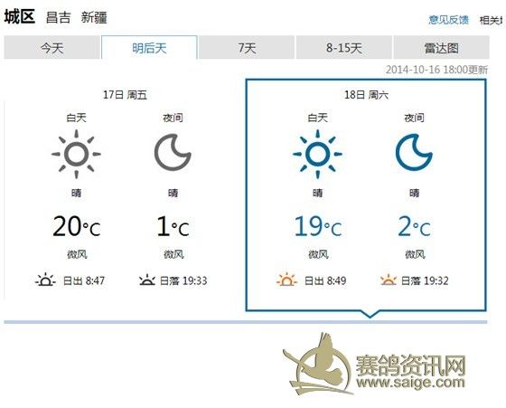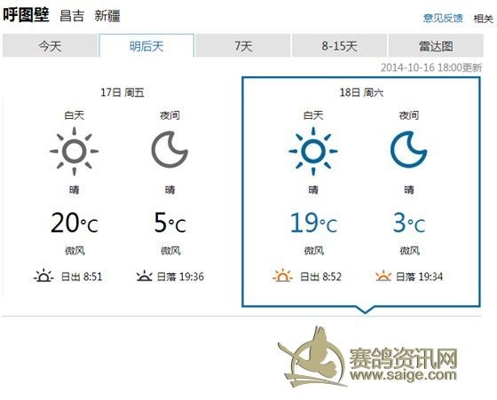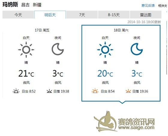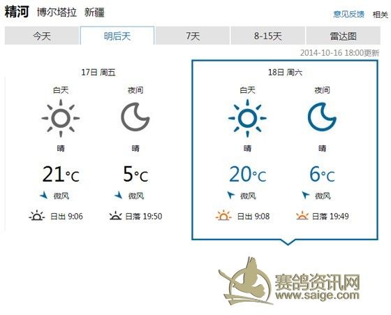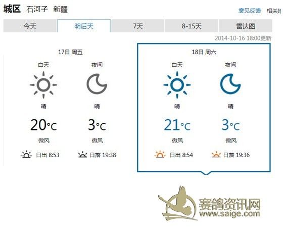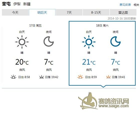400Km三关赛竞赛公告 飞天大爱秋棚400Km三关赛定于本月18举行,17日集鸽(如天气变化,另行通告),届时(集鸽开始)鸽友代表将全程监督赛事。欢迎广大鸽友来公棚观摩,观赛。 欢迎广大鸽友踊跃参与指定鸽和汽车大奖赛的活动。 注:华凌鸽市麒麟玉器店内(7排D区11号)设置的指定鸽和汽车大奖赛收费点,收费截止日期2014年10月17日。收费时间:北京时间11时至18时。联系电话: 18097629055(周女士)。 附:1、监赛鸽友代表名单: 6名木拉冰山鸽舍(阿勒泰)不能来,16名巫波涛(乌鲁木齐)不能来,26名恒泰达鸽业(石河子),36名丰尊园(乌鲁木齐)不能来,46名西北小旋风刘毅(芳草湖),56名高玉礼(乌鲁木齐)不能来,66名火蓝鸽舍孟小钧(昌吉),76名王翔+李健兄弟鸽舍(库尔勒),86名艾合买提.阿布都热音(库尔勒)不能来, 96名千小空鸽舍(乌鲁木齐)。 2、沿途城市天气