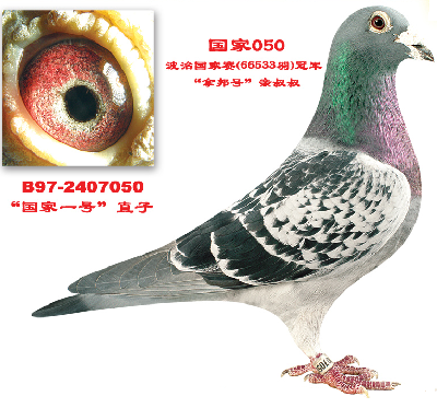 “国家一号”家族中特别值得一提的是比利时赛鸽强毫“菲利普。吉尔特”先生使翔的“国家一号”直孙“拿帮号”----B95-4516090 灰色黄眼雄鸽,它在一年内参加两次波治国家赛。1996年5月26日波治第一次全国10049羽456KM荣获23名,1996年7月27日波治第二次全国66533羽456KM荣获总冠军,超速亚军17分钟。它便是“国家一号”直子B93-2053961深斑黄眼雄作出的。而“菲利普。吉尔特”先生又用“拿帮号”的直女作出了2002波治全国57004羽的冠军,再次赢得的波治赛冠军,充分显示了“国家一号”威力,显示了“拿帮号”青出于蓝而胜与蓝的真实价值。