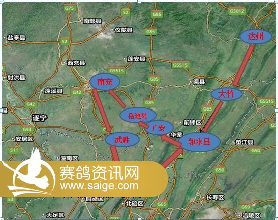 尊敬的鸽友您好: 为了更好的服务,让您的爱鸽更加安全快捷到达公棚,新东方公棚定7月30日(星期一)在以下地区收鸽:(达州、大竹、邻水、广安、岳池、南充、武胜)联系电话:张师傅18983669813、13883915692 沿途有交鸽的鸽友请尽早与张师傅或地区对应代收点联系。请大家相互转告! 重庆新东方国际赛鸽公棚7月30日接鸽路线图