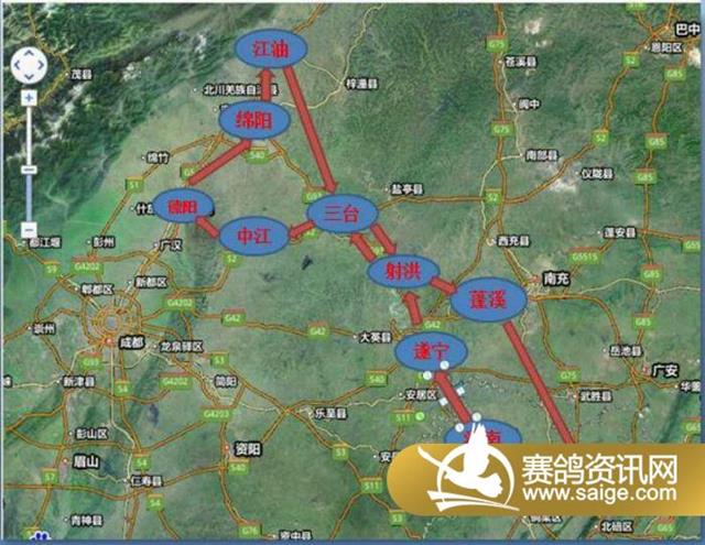 线路一:途径中江、德阳、江油、绵阳、三台、射洪、蓬溪、遂宁;