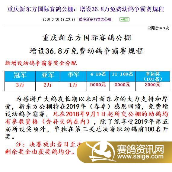 尊敬的鸽友:重庆新东方国际赛鸽公棚根据最新天气预报情况,第三关总决赛暂定于4月30日晚集鸽上笼,5月2日放出(遇雨顺延、则另行通知),按章程获得第二关第一名、七名、十八名、二十七名、三十八名、五十二名的鸽友负责监放三关总决赛,请以上鸽友做好准备,听候通知。第三关外围指定正在火热进行中,截止时间为4月30日上午10点止。请鸽友们仔细核对外围指定是否有误,如有误请来电公棚023-42666123和.42669123.谢谢大家的支持,预祝朋友们在决赛中取得好成绩!