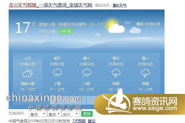 尊敬的鸽友们,比赛期间让大家能随时了解到重庆新东方公棚一周天气情况,现将气象台播报之情况报道如下,供大家参考。