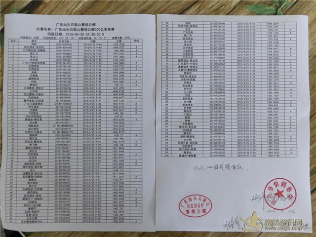 广东汕头石鼓山赛鸽公棚预赛成绩单
