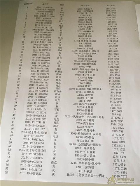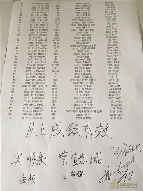 广东汕头石鼓山赛鸽公棚2016年预赛前100名名单