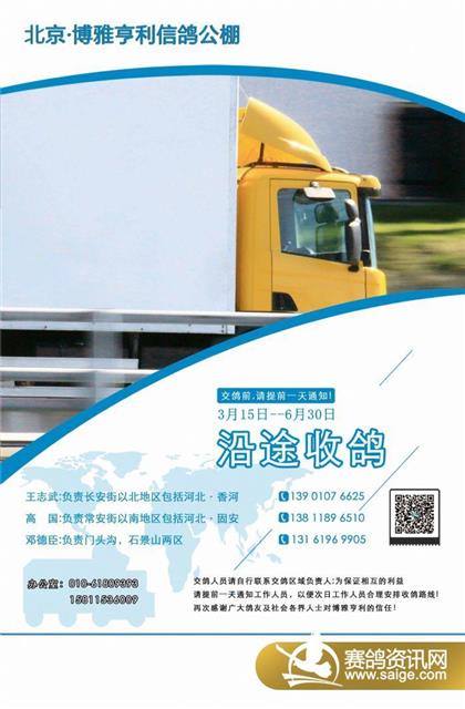 博雅亨利公棚 于3.15开始收鸽啦! 交鸽人员请自行联系交鸽区域负责人;为保证相互的利益 请提前一天通知工作人员,以便次日工作人员合理安排收鸽路线! 再次感谢广大鸽友及社会各界人士对博雅亨利的信任! 王志武:负责长安街以北地区包括河北·香河 139 0107 6625 高 国:负责常安街以南地区包括河北·固安 138 1189 6510 邓德臣:负责门头沟,石景山两区 131 6196 9905 办公室:010-61809393 15811536009