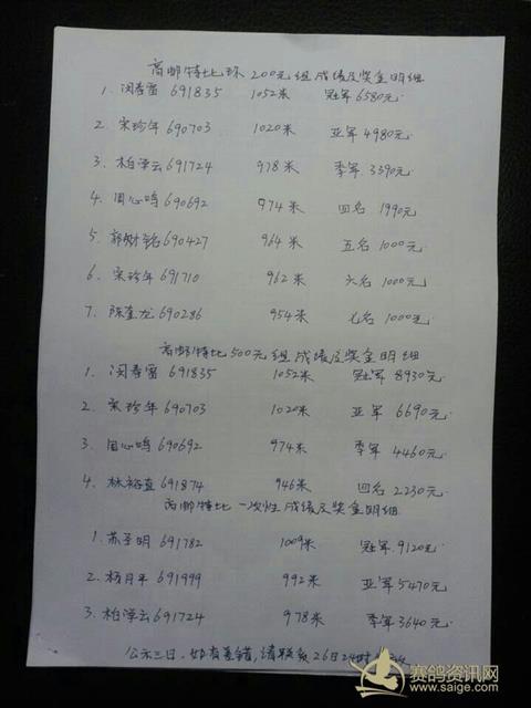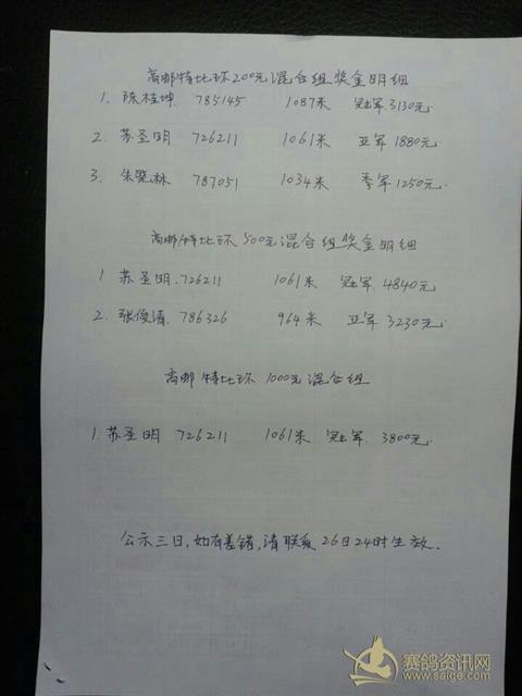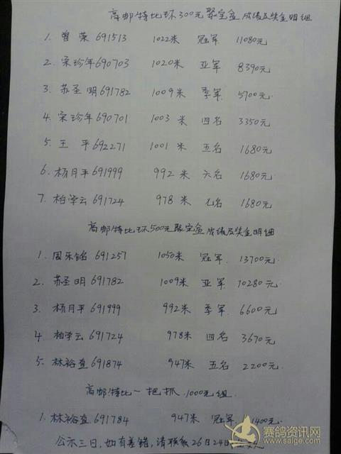 2014年高邮特比环鑫润赛鸽俱乐部各项指定成绩