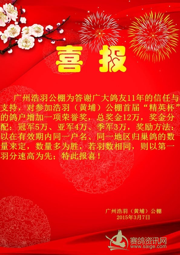 广州市浩羽(黄埔)赛鸽公棚喜报