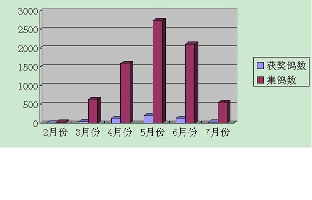 综合2016年的广州浩羽(黄埔)公棚获奖鸽及集鸽数据,做了一图表,得出不同月份入棚鸽数与获奖鸽数的比例不同,其获奖率分别为: