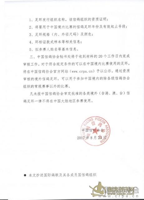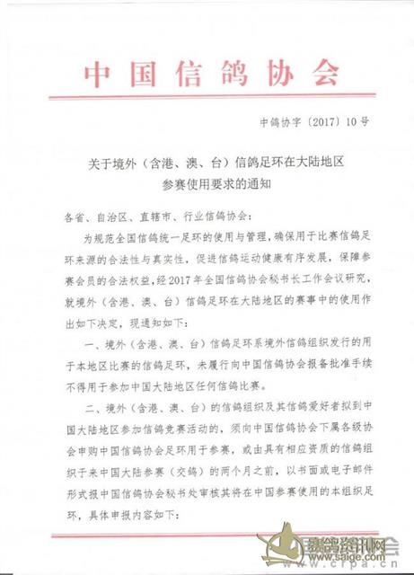 以下是中鸽协于2017年8月23日发表的关于境外信鸽足环在大陆参赛要求的通知,从2018年开始,所有未报备的外籍足环一律不能参加公棚比赛,报备流程:先到当地信鸽协会报备;当地信鸽协会再向中鸽协报备,待中鸽协审定批准即可参赛,请各位代理在集鸽时留意外籍足环,另有明显疾病或精神不振的幼鸽暂不托运,待鸽主调理健康后再送。