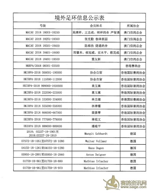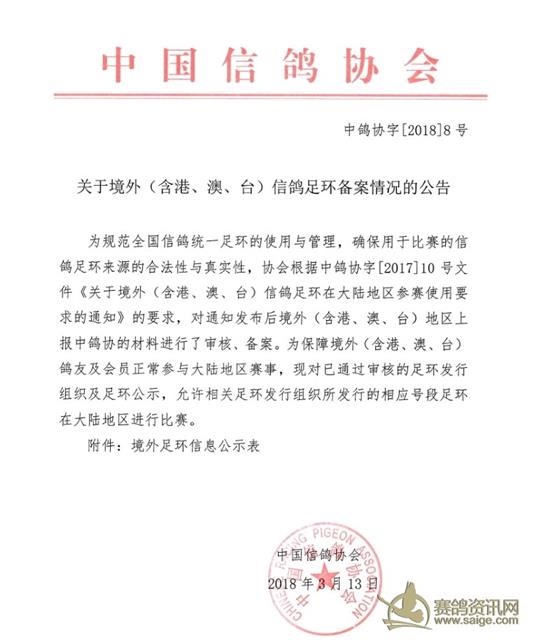 为规范全国信鸽统一足环的使用与管理,确保用于比赛的信鸽足环来源的合法性与真实性,协会根据中鸽协字[2017]10号文件《关于境外(含港、澳、台)信鸽足环在大陆地区参赛使用要求的通知》的要求,对通知发布后境外(含港、澳、台)地区上报中鸽协的材料进行了审核、备案。为保障(含港、澳、台)地区鸽友及会员正常参与大陆地区赛事,现对已通过审核的足环发行组织及足环公示,允许相关足环发行组织所发行的相应号段足环在大陆地区进行比赛。