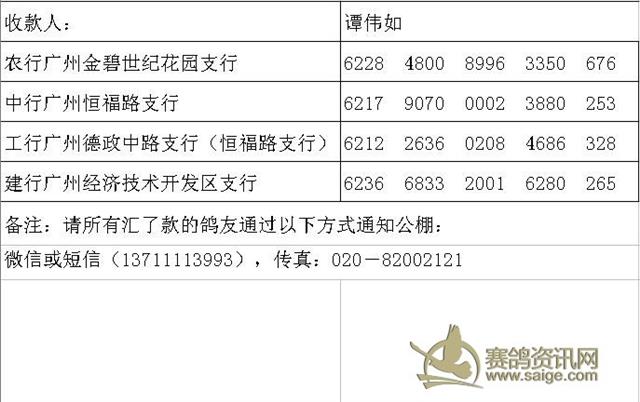 3、请诸位代理统计好集鸽数据,我们会逐一核对今年的代理鸽数与代收的保证金总额;未交保证金的鸽户请在7月20日之前自觉交纳保证金2000元,清棚后保证金转为参赛费,若鸽主无缘今年的比赛,保证金原数退回,感谢大家的支持与信任!