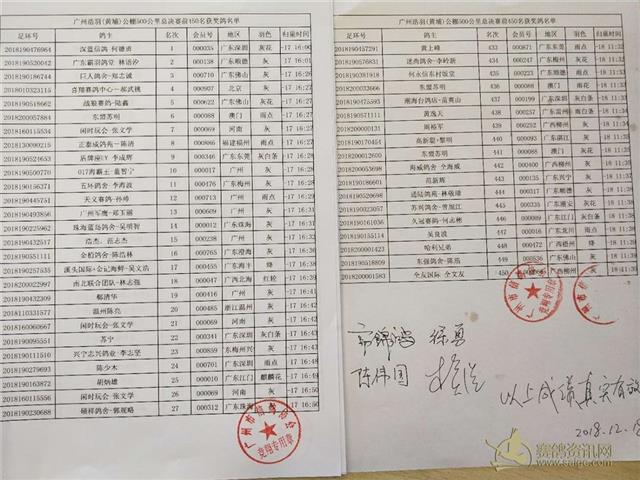 广州浩羽(黄埔)公棚总决赛前450名获奖鸽名单裁判签名表