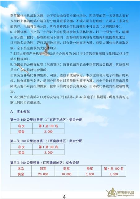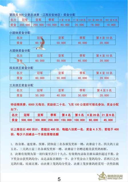 特设精英赛,6000元每羽,奖励前二十名,飞完100公里即可报名参加,奖金分配如下:
