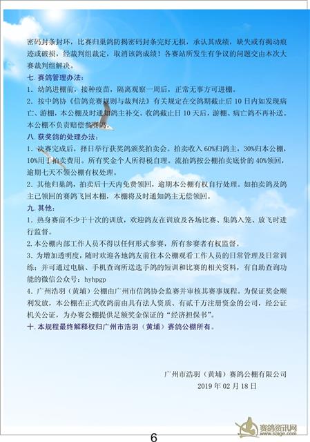 3、其他条件均按2019年广州市浩羽(黄埔)赛鸽公棚第五届竞翔规程执行。