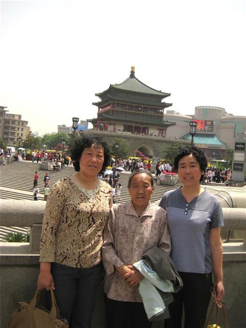 上图为养鸽人的妹妹、母亲、妻子在西安钟楼留影