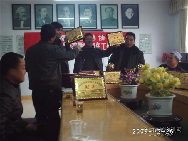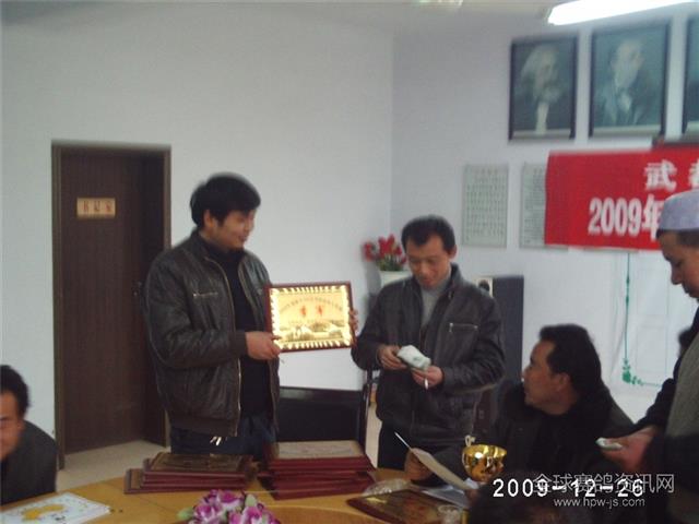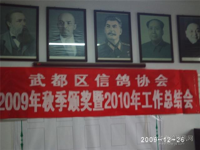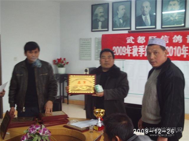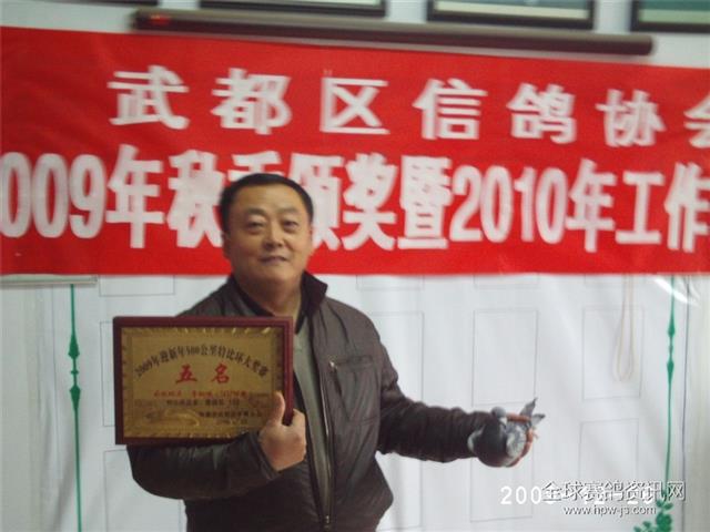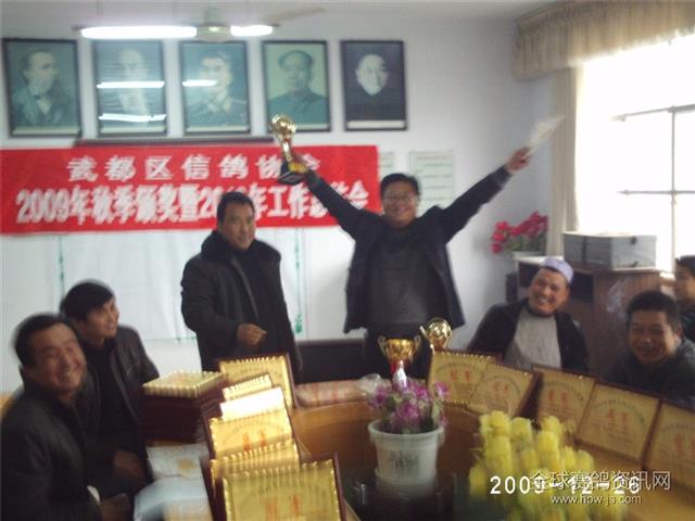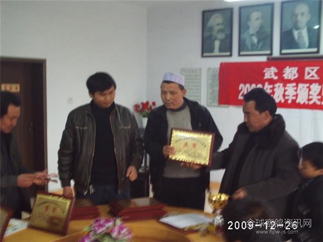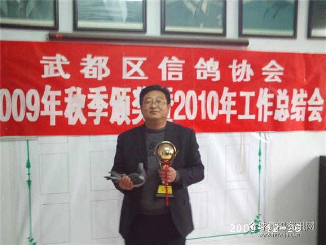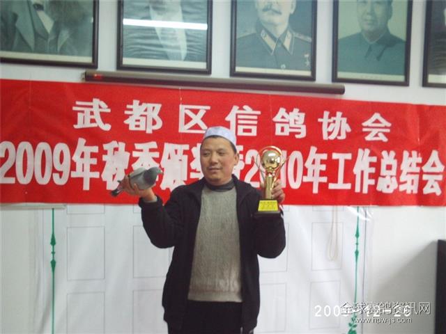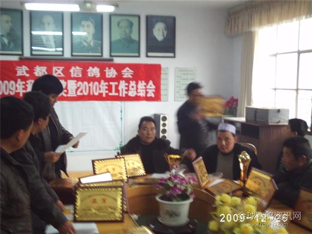 武都位于甘、陕、川交界处,属长江上游流域、处于亚热带区域,山大沟深,条件艰苦。武都区鸽协“迎新年杯”冬季500公里大奖赛暨09年工作总结、2010年工作安排会议今日举行。会议前鸽协负责人向区文体局汇报了09年工作,得到文体局领导赞扬。区文体局派员检查了冬季500公里大赛优胜鸽各种手续,经确认后在奖状上加盖公章,予以褒奖。12月26日中午后天气突变,气温由7度下降至零下2度-零下5度。冷空气袭来,北风迎面劲吹,雪花漫天飘舞,大幅降温使人感到冬季“一九”寒潮比上次寒潮还肆无忌惮。剧烈的降温阻挡不住会员的参会热情,他们从距城区十几公里外的两水、马街、安化等地赶来,即参加颁奖仪式也好好聚一聚庆祝武都鸽协成立20周年。 面对大风强降温天气,颁奖会议开的喜洋洋热腾腾。会议先后对“幼鸽特比环奖赛”、幼鸽指定鸽排名奖赛”、“幼、成鸽普赛综合奖”、“国庆60周年、武都鸽协成立20周年纪念杯”、“迎新年”杯500公里综合排名、“成鸽奖”等六个奖项颁发了奖牌和奖杯以及奖状和归巢证。对“幼鸽特比环奖赛”得主50人次颁发了奖金,对“幼鸽指定鸽排名奖赛”28人次颁发了奖金。 冬季“500公里特比环”奖金总共5750元,设1-50名,颁发600元-50元不等的奖金。“幼鸽奖”赛总共2700元,设1-28名,颁发500元-50元不等的奖金。“指定鸽”1500元,设1-8名,颁发500-70元不等的奖金,“成鸽奖”380元,设1-3名颁发80-200元不等的奖金。“300公里奖”总共设奖750元。这次会议总共核发奖金一万一千元。会议开的很成功。 会议还对2010年鸽协具体工作做了部署。在做好2010年300公里、500公里春赛、秋赛及500公里“春季特比环”赛的前提下,动员鸽友踊跃参加“2010年国家赛”。2010年国家赛兰州赛区300公里及以上级别将在兰州司放,武都距兰州空距312公里,正好符合300公里级别。这也是距1994年停放兰州赛线15年后的新挑战,也是武都鸽协代表甘肃省参加南阳“首届国家赛”后又一次出现在国家赛上,虽然西线长期停赛后赛线不顺,但鸽友们摩拳擦掌,纷纷说如今的武都赛鸽飞这点距离不在话下,人人都想夺得国家赛兰州赛区300公冠军,好为“育翔师”添分加彩。鸽协会员提出了很多合理化的建议,为2010年继续打好各项比赛建言献策。鸽协一班人表示要团结一心,做好服务,以武都山区人坚强不屈的个性再显山区养鸽人的雄心壮志,培育和打造山区赛鸽善飞钻山不屈不挠的英姿。