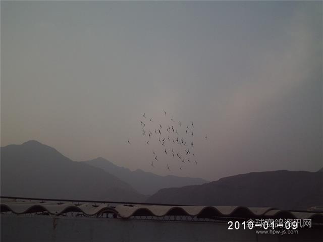 上图为夕阳中家飞的鸽群