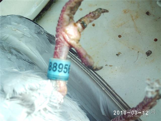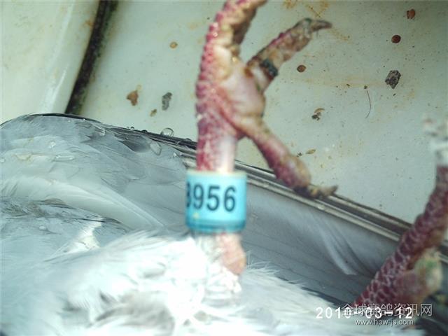 这是一只让我寄于厚望的信鸽,足环号2003-588956雌、黄眼、中斑。它的身上聚集着“波城冠军”的血脉,是一羽纯正的詹森年青麦克斯系的鸽子。这只年青麦克斯孙2月6日从广东引进,虽然年龄有些大了,但由于其纯正的血统,曾经让人暗自欢喜。在西安咸阳飞机场接鸽后,接鸽者一羽羽检查,然后欣喜若狂的打电话告诉我,一羽雨点鸽子有蛋,快要下了。2日7日鸽子从西安运抵武都,由建平鸽友养着。他也给在兰州出差的我打电话说:“一羽雨点快要生蛋了。”我说:“你先养着,下了蛋就是你的。”他好生喜欢精心饲养了十天,蛋仍未下。便在腊月三十和三个鸽友一起将引进的鸽子送到我家里。