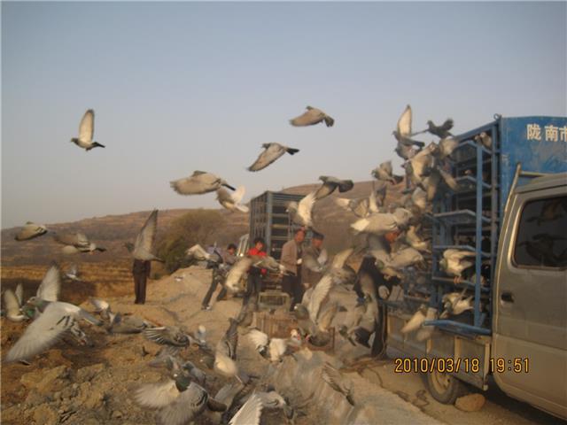 在天水同一地点开笼司放的还有陇南市信鸽协会组织的400多羽参赛鸽。陇南市、武都区两级鸽会分别组织春季信鸽大赛活动,3月19日这一天两级协会两部赛鸽车在司放地不期而遇,将陇南市武都城区800多羽参赛鸽推向了高潮迭起如火如荼的春季赛场。在武都区春季“三关赛”进行的同时,分别佩戴陇南市、武都区信鸽协会春季“特比环”的参赛鸽也一并正常参加训放,同时参加“三关赛”的参赛鸽计录“三关赛”成绩。这次司放天水150公里比赛,也最有力的证明了陇南市武都城区2010年春赛规模和参赛鸽数量,武都城区的赛鸽水平、参赛鸽数量、饲养赛鸽规模和养鸽人数始终走在全市八县一区的前列。
