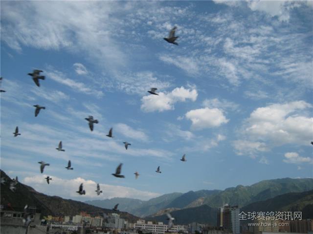 盛夏酷暑暮鼓中驱鸽翱翔蓝天,养鸽人心情真是舒畅。