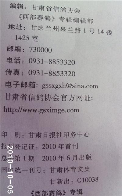 《西部赛鸽(首刊)》读书札记 中秋时友人从兰州捎来一个省体育局大信封,接到手上感觉厚厚的沉甸甸的,拆开信封映入眼帘的是一本印刷精美的《西部赛鸽(首刊)》杂志。迅速浏览了一遍就顿感立意新、触角奇、视角宽、起点高,西部赛鸽杂志所涉内容尤如秋收后的果实摆满一桌,琳琅满目扣人心弦。西部赛鸽杂志彰显了勤劳勇敢、忠厚善良的甘肃人团结奋斗、不屈不挠、勇往直前的“甘肃精神”,弘扬了甘肃群众体育文化构造和谐社会建设小康生活的主旋律,紧跟时代步伐,紧扣信鸽运动主题,站在赛鸽运动前沿,将西部赛鸽状况、西部赛鸽人精神风貌、西部文化特色、西部著名鸽舍呈现在了世人面前。西部赛鸽的出版发行是值得关注和庆贺的一件鸽坛喜事,它添补了大西北省、市、区信鸽杂志的空白,它以全新的面目和独道的视点稳立时代潮头,和国内外众多信鸽刊物济济一堂,尽心竭力服务于甘肃养鸽人、西部养鸽人,真正使甘肃养鸽人、西部养鸽人喜出望外喜上心头。 《西部赛鸽(首刊)》杂志是一本甘肃省信鸽运动协会主办的会刊。杂志封面“开拓视野、创新理念、和谐进步、共铸辉煌”的十六个字特别耐人寻味。打开杂志那一幅幅精神抖擞的西部赛鸽图画及参赛鸽成绩历历在目,将人引向了信鸽竞赛战场,一场场信鸽赛事使人心花怒放欲罢不能,不死必归的信鸽从五百公里、一千公里披荆斩棘归巢报到的情景激动人心,信鸽在艰难困苦的环境下历经磨难竭尽全力的精神催人奋进。回首往事我仰望长空变幻出无尽的暇思,也像一罈老酒越老越香越品越淳让人回味无穷。 “中华信鸽有几千年历史我们有条件有信心赶上世界先进水平”。全国人大吴邦国委员长多年前的题词说出了鸽友的心里话,也证明了我国信鸽事业的发展进入了前所未有的崭新的历史发展阶段,各级信鸽协会得到了国家和地方政府的认可和支持,而今中国信鸽事业的发展势如破竹,信鸽公棚赛事此起彼伏,信鸽地方赛事如火如荼,信鸽国家赛事规行矩步,信鸽运动的发展已进入了一个最好的发展时期。中国信鸽运动已和国际信鸽接轨,第三十四届国际鸽联奥林匹克大会己由国内宁波市承办,这是我们养鸽人最值得自豪、最值得鼓与呼的事情。现阶段最关键的就是各级信鸽协会要整章建制调正船头有序运行,使信鸽运动发展健康有序的步入一个新的发展水平。这需要所有信鸽协会会员和爱鸽、养鸽的朋友共同努力维护信鸽运动发展的大好趋势,既要维护荣誉更要打假拒赌,还要以良好的修养和素质搞好精神文明建设,以中国养鸽人的荣誉感、自豪感大力提升信鸽运动发展的质量和水平。 《西部赛鸽》杂志与时俱进,和日新月异的时代步伐同步,让大西部的信鸽事业汇入世界信鸽事业的洪流,给西部鸽友创建了一个交流学习的平台,让西部鸽友搭载科学化、制度化、法规化、信息化的直通车,实现人生赛鸽的梦想。“《西部赛鸽》历经二十四载风霜雨雪的孕育,在几代养鸽人的精心呵护和期盼中,终于呱呱坠地了!” 精彩文章让人赏心悦目,精典赛事让人心惊肉跳,精美图画让人刮目相看,精神果实让人诚心收藏。 我们从西部赛鸽所设刊首语、关注、嘹望、记忆、欣赏、训养等6个主栏目和多个子栏目里了解国内外信鸽运动发展现状。从“中鸽协方略”里了解国家群体运动管理中心、中国信鸽运动协会的官方动态。在“省鸽协视点”里了解西部各省市区信鸽协会发展动向。在“西部公棚”里搜寻参赛鸽赛绩。在“西部精典赛事”里了解西部省会城市精典信鸽赛事。我们在“热点争鸣”里说事搭理辨明是非。在“域外拾遗”中博古通今追根溯源,了解国内外信鸽历史和信鸽文化。在“赛绩档案”里寻找昔日的爱鸽,炫耀曾经的辉煌。在“鸽友轶事”里回味鸽友养鸽的执拗,鸽友间多年交往的情真意切,还有那养鸽、训鸽中提起就令人捧腹大笑的一件件“囧”事。在“陇原旧事”里拾起趣闻轶事,回忆当年的辛酸和无愧。在“鸽坛文苑”里尽显西部养鸽人撰写鸽文的执迷不悟和妙语风采。在“古风雅词”里证明养鸽人的高尚情操和大雅风范。在“疾病防治”栏目掌握信鸽疾病的辨别、预防、治疗的防控知识。在“信鸽育养”中掌握信鸽种、育、养、训、赛的真谛。在“经验交流”里切磋养鸽技艺不断提高我们的养鸽水平。 愿《西部赛鸽》立足甘肃,着眼陕西、宁夏、青海、新疆等省(区)的信鸽赛事,放眼大西部信鸽事业,站得高看得远,讴歌时代主旋律,掌握正确的舆论导向、引导西部信鸽协会会员科学养鸽、文明养鸽。注重家庭美德、职业道德、社会公德的自我约束,在群众体育文化生活中让“信鸽竞赛”活动独树一帜,让群众体育文化生活中的“信鸽竞赛”活动登上大雅之堂,让“信鸽竞赛”活动得到全社会的尊重和支持,从而推动信鸽运动的全面发展。当然这需要我们一代又一代养鸽人的不懈努力。西部赛鸽风云变幻,西部赛鸽扬善抑恶,西部赛鸽劲头正足,西部赛鸽扬帆启航,西部赛鸽要在引领西部信鸽运动健康发展,提高西部信鸽的竞赛水平工作中做出自己应有的贡献,这就是西部养鸽人对《西部赛鸽》的真诚期待。