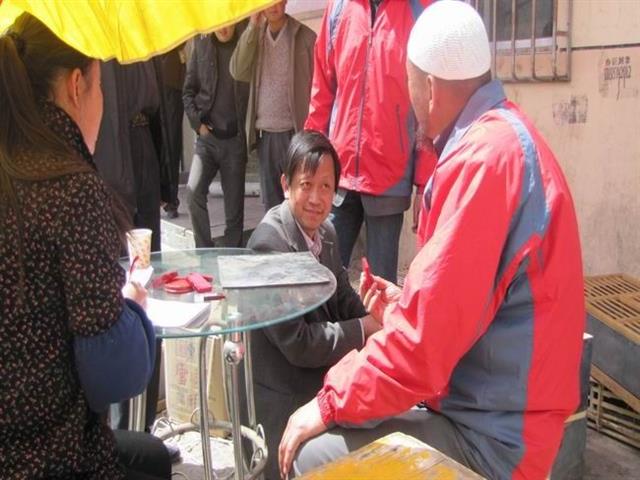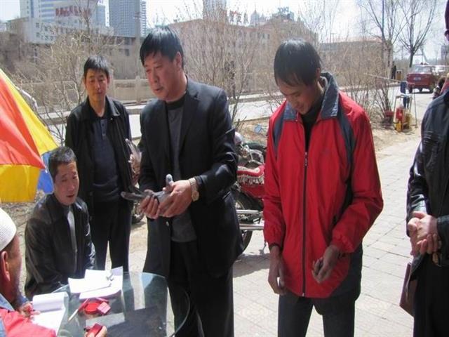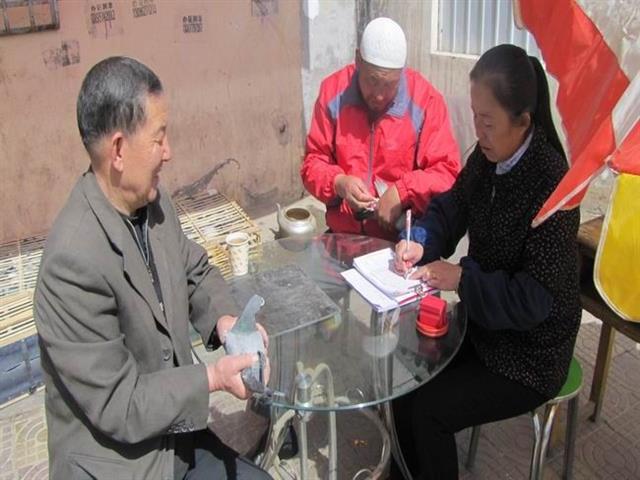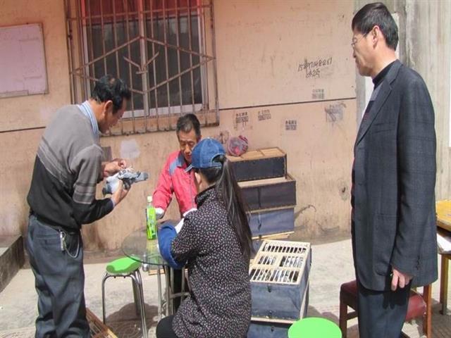 青海乐都鸽友与集鸽裁判核对信鸽足环