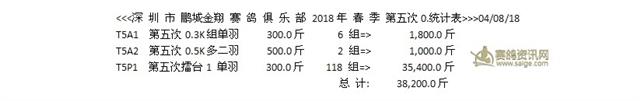 鹏城金翔 赛 鸽 俱 乐 部 2018年 春 季 第五次插组统计表