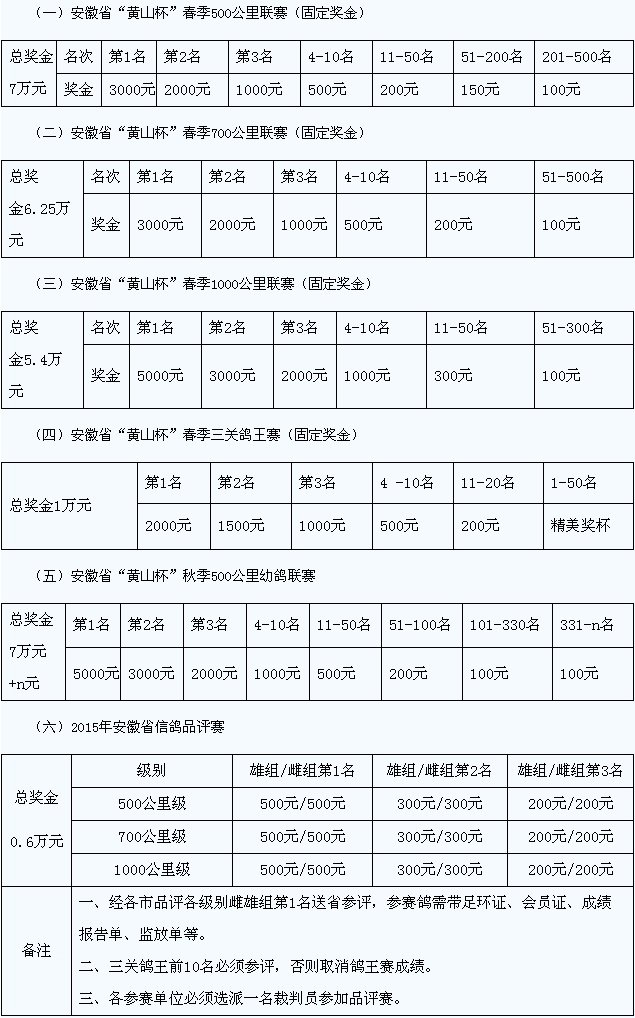 (七)500公里、700公里、1000公里联赛前十名颁发奖杯,前200名颁发奖状;“黄山杯”大兴站四个赛区前三名颁发奖杯,有效名次内颁发奖状;三关鸽王赛前50名颁发奖杯、奖状,前20名颁发奖金。三关鸽王的评比从500、700、1000公里有效报到时间内产生(500公里取前1000名,700公里取前700名,1000公里取前500名),三关分速相加高者为先,如分速相同,1000公里名次前者为先。