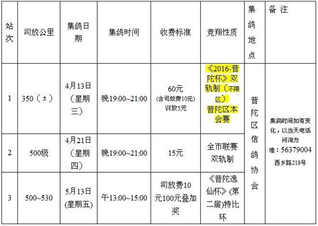上海市普陀区信鸽协会《2016-普陀杯》春季信鸽大奖赛规程
