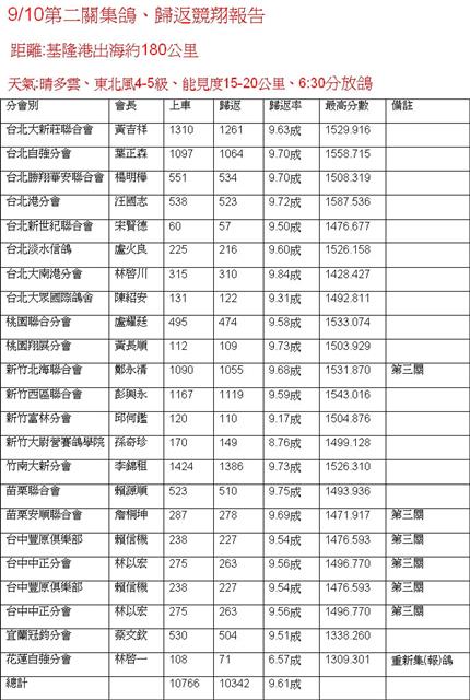 2008年北海競翔聯合船隊秋季比賽第二關歸返鴿數一覽表2008.9.10
