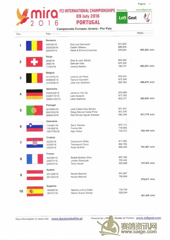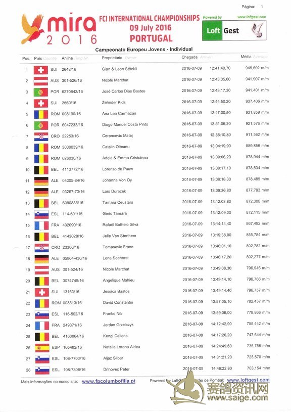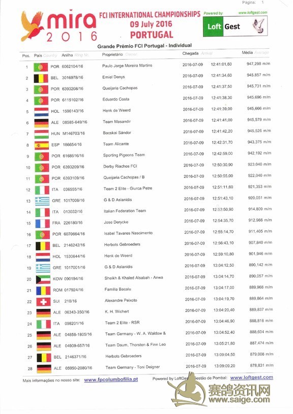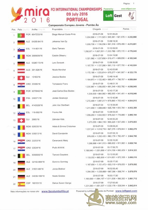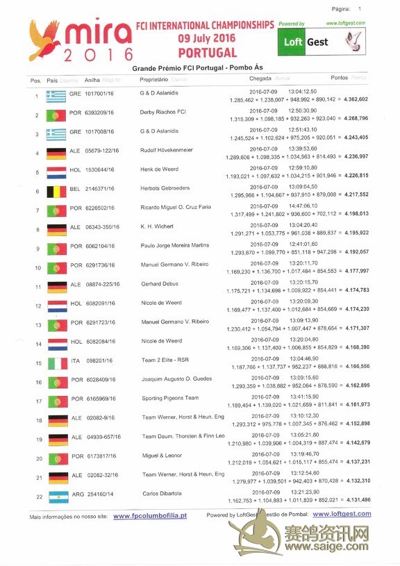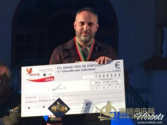 原文报道: Grand Prix Portugal - Mira 2016 On the 9th of July the 20th edition of the Mira One Loft Race took place in Portugal. The oldest One Loft Race from Portugal showed once again their professionality and experience. Mira, a little town along the coast almost in the middle of Portugal, since 20 years the place for a huge gathering of pigeonfanciers. With the 20th edition this one loft race is the oldest in Portugal and it shows. They have the routine of very experienced organizers and make it as professional as possible. Fancier from 21 countries send in their pigeons to this race. As they have their own quarantine it is easy for people from outside Europe to send in birds and this is really appreciated. A simple loft with all the necessary requirements to keep the pigeons in good health. The loft has room for about 4,000 birds but the organization only allows 2,000 birds. This because they like the pigeons to have enough space and to feel at home. Even for this amount of pigeons the loft feels very cozy.     This year they didn't reach the amount of 2,000 birds and this for several reasons. First of all the registration fee went from 50€ last year to 100€ this year, for us still very payable but in Portugal this is becoming too expensive for many people. Now the Portuguese fanciers send in half as much pigeons as it costs half as much more. Another thing that we can't go around is the fact that Portugal has 6 (!!) one loft races. Maybe they're becoming their own competitors? Nevertheless this is still a very wonderful race that is being organized very professional. I mustn't say that the Portuguese people are very friendly and welcoming but they are also good at the organization of this one loft race. The latest fancy updates in pigeonsport is being used here and this has a lot to do with the cooperation of Benzing. The registration of the birds runs very smoothly, there are camera's everywhere and a big screen is placed to see the home coming of the pigeons. And immediatly after the registration of the birds you can see clearly the ranking, name, ringnumber and so on from the pigeon.     Basketing The evening before the race we could have look at the basketing of the pigeons. A large group of volonteers were present to make sure everything was checked, double checked and this ran very smoothly. Even the Portugueze President José Luis Jacinto helped out basketing the pigeons. A great example of team work was shown.     Weather conditions One thing I really want to share with you is the fact that the evening before the release of the birds we all got underneath paper...a clear overview with all details needed along the flying route !!! The Portuguese Federation has an arrangement with the weather official of Portugal and they get all data they need. Off course, they don't get if for free, it costs money and a lot of money, but the Portuguese Federation likes to spent money on something as important as this.     Results No One Loft Race without a winner. This year the winner of the final race and also the overal winner was a Portuguese fancier namely Paulo Jorge Moreira Martins. The nice thing about this winner is that he only entered 1 pigeon ! How lucky can you get ! First belgian arrival was Emil Denys with a very nice 4th position. Emil Denys even ended 2nd on the overal result list. First belgian Ace Bird in Mira (and the only belgian ace bird in the top 20) was on of Herbots Gebr. on the 6th place.     After a hot Portuguese afternoon, a nice lunch at the loft and the selling of about 20 participating pigeons on spot, all winners were honored at a wonderful location in Mira with food and drinks. It was very nice to see that the Belgian youth did very well on this one loft race, not only the individual race but also the team did well. Please have a look at all rankings of this 20th edition of the Mira One Loft Race on the 09th of July 2016.     Even the present journalists were honored and thanked for their attention as they know that every publicity is very important. Thank you for the attention and appreciation .     I really want to thank the organization for this amazing well organized one loft race. Everything a one loft race needs is present here. Congratulations and up for the next 20 years? 原文翻译参考: 米拉- 2016年葡萄牙大奖赛 7月9日,葡萄牙米拉开展一个鸽舍比赛。最古老的一个鸽舍葡萄牙的比赛再次显示专业性和经验。 米拉是葡萄牙沿海岸的一个小镇,20年来是鸽友的聚集地。这一20年来最古老的葡萄牙鸽舍比赛,他们的组织者非常有经验,让它尽可能的专业。爱好者们从21个国家送他们的鸽子参赛。他们有自己的检疫的人,很容易运欧洲以外的鸟,这是非常感激。一个简单的鸽舍,所有必须要求保持健康的鸽子。鸽舍的房间可以容纳大约4000只鸽子,但组织只允许2000只。这是因为他们喜欢让鸽子有足够的空间和宾至如归的感受,让这鸽舍的鸽子感觉非常舒适。 今年他们没有达到2000只鸽子的数量,这有几个原因。首先注册费用从去年50欧元提升到100欧元,在葡萄牙这对许多人来说变得太贵了。现在葡萄牙鸽友送去一半的鸽子,因为它成本的一半。不过这仍然是一个非常精彩的比赛,组织非常专业。葡萄牙人们不但非常友好和好客,他们也擅长鸽舍竞赛的组织。登记的鸟类顺利运行,到处都有相机和一个大屏幕上播放家里的鸽子。马上登记的鸟类可以清楚地看到排名,名字,鸽子环号等等。 篮子 比赛前的晚上我们可以看笼里的赛鸽。一大群志愿者在场,以确保一切都检查,双重检查非常顺利。甚至葡萄牙总统何塞•路易斯•哈辛托帮忙篮子鸽子。一个伟大的团队合作的示范例子。 天气状况 我真的想与你分享一件事是,晚上开笼前,我们都有纸……一个清晰的概述与所