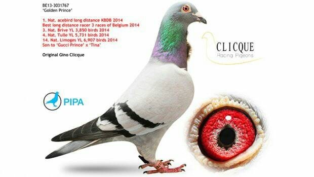 这羽天价鸽“黄金王子”,是比利时赛鸽名家吉诺·克里克的超级战将,环号为B13-3031767,灰雄,获得2014年KBDB全国长距离一岁鸽组鸽王冠军。当年,它参加了三场比赛,分别获得图勒全国赛5731羽4名、布瑞福全国赛3850羽3名、利蒙治全国赛6907羽14名,以两场比赛综合得分系数为0.1477%的好成绩,勇夺KBDB鸽王冠军。
