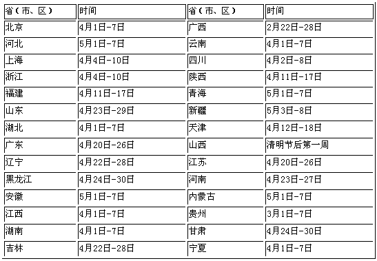 1981年,中国国务院批转了林业部等8个部门《关于加强鸟类保护执行中日候鸟保护协定的请示》报告,要求各省、市、自治区都要认真执行,并确定在每年的4月至4月初的某一个星期为“爱鸟周”,在此期间开展各种宣传教育活动。由于中国幅员辽阔,南北气候不同,各地选定的爱鸟周时间也不尽相同。详见下表: