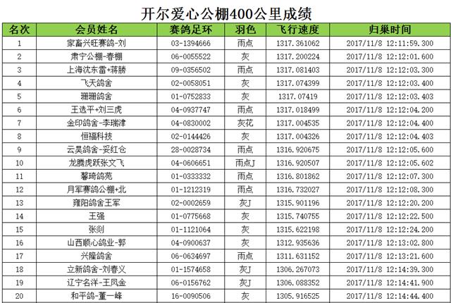 中午12点11分左右,从公棚东南方向飞来第一梯队20羽赛鸽,家畜兴旺赛鸽-刘雷的一羽足环号为03-1394666的赛鸽以1317.36的高分速率先归巢,勇夺冠军;肃宁公棚-春棚,足环号为06-0055522的赛鸽以 1317.200的分速获得亚军;上海沈东雷+蒋勝足环号为09-0356502的赛鸽以1317.08的分速夺得季军,随后赛鸽陆续组团归巢。截止到14点18分,已经有4141羽赛鸽归巢。