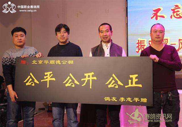 颁奖现场,华顺德收到了鸽友李志平、戴秉国赠送的两块写有“公平,公正,公开”的牌匾。华顺德公棚凭借透明的赛制,“以鸽为本,鸽友第一“的宗旨越办越好,参赛费由1300、1600、2000一直到2018年竞赛规程中的3300元不断攀升,公棚的实力也一步歩增强。希望华顺德公棚在今后越办越好,也祝鸽友们飞出好成绩。
