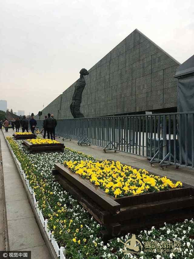 侵华日军南京大屠杀遇难同胞纪念馆外边,摆放了数千盆鲜花。