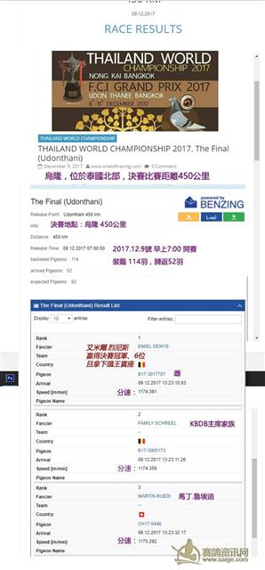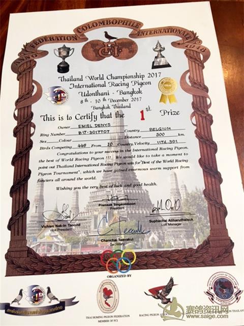 奥林匹克世锦赛会员国-FCI泰国曼谷公棚,今年10国集鸽2090羽,历经14次100公里到125公里训练赛、预赛210公里,决赛在乌隆,位於泰国北部,比赛距离450公里举行。艾密尔的一羽灰雌B17-3017707以分速1174.391赢得2017年的决赛冠军。B17-3017266赢得决赛6位。