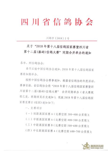 关于“2018年第十八届信鸽国家赛暨四川省第十二届(秦岭)信鸽大赛”同期合并举办的通知